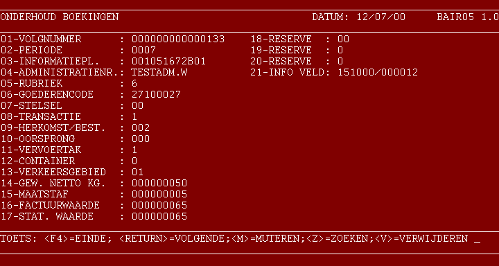 Per boeking kan gekozen worden voor einde programma (toets <F4>), naar de volgende boeking (toets <RETURN>), boeking muteren (toets <M>), boeking verwijderen (toets <V>) of zoeken naar een bepaald gegeven in een boeking (toets <Z>).