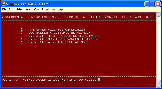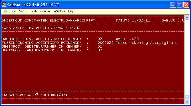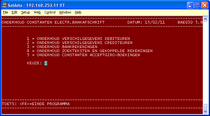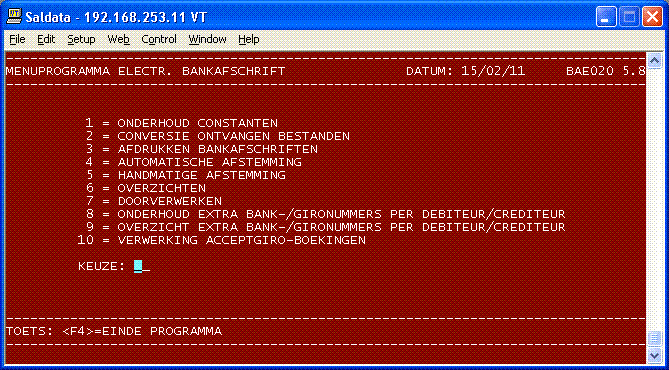 Programmanummer: 133 Omschrijving : ELECTR. BANKAFSCHR. Programmanaam : BAE010Uiteraard mag het programma ook op een andere plaats in het menu worden opgenomen. Wanneer u met meerdere bedrijven werkt, moet dit programma in elk bedrijf afzonderlijk in het menu worden geplaatst.Ook moet de programma-directory /usr/bbx/bas_tel.prg/ aan de configuratie togevoegd worden.