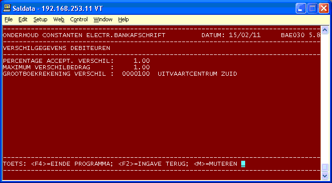 - Bankrekeningnummer (moet aan de zgn. 11-proef voldoen); - Bedrijfsletter; - Dagboeknummer, moet met programma A/I/M Dagboeken aangemaakt zijn. Via de <F1>-toets kan een info op de dagboeken gepleegd worden.Opmerking over het veld bedrijfsletter: