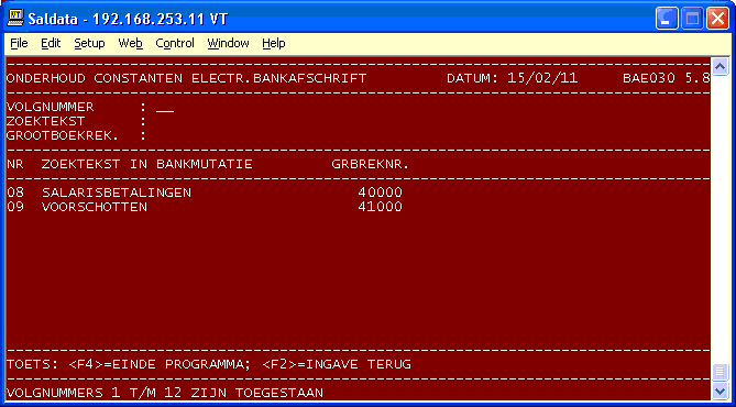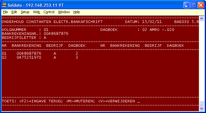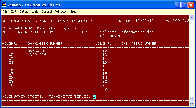 - Code debiteur of crediteur: D of K; - Debiteur of crediteurnummer (waarbij via de <F3>-toets met een zoeksleutel gezocht kan worden).Per debiteur of crediteur zijn de extra bankrekeningnummers en/of gironummers via een volgnummer van 1 t/m 22 te benaderen. Na ingave van het volgnummer kan het betreffende rekeningnummer ingegeven, gewijzigd of verwijderd worden. Uiteraard vindt controle via het zoeksleutelbestand plaats of het rekeningnummer al aan een andere debiteur of crediteur is gekoppeld. Via de <F2>-toets kan altijd naar de vorige ingave teruggegaan worden.