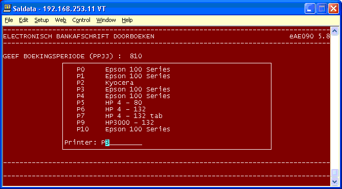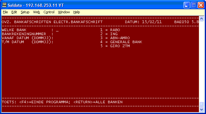 Keuze: Van welke bank moeten de dagafschriften afgedrukt worden. Geef <RETURN> voor alle banken of maak een keuze uit één van de banken op het beeldscherm. Keuze: Van welke bankrekening moeten de dagafschriften afge- drukt worden. Geef <RETURN> voor alle bankrekening- nummers bij de betreffende bank of geef het gewenste bankrekeningnummer in. Is echter gekozen voor het af- drukken voor alle banken, dan wordt deze keuze over- geslagen. Op het beeldscherm wordt in dat geval aan- gegeven dat afschriften voor alle rekeningen worden afgedrukt. Keuze: Vanaf datum (DDMMJJ). Met deze datum wordt de datum van de conversie naar het standaard formaat bedoeld. Keuze: Tot en met datum (DDMMJJ). Hiervoor geldt hetzelfde als bij de datum vanaf. Keuze: Printernummer. Maak een keuze uit één van de printers op het beeldscherm. Keuze: INGAVES AKKOORD? <RETURN>/<N>. Maak de juiste keuze. Keuze: WILT U EEN TESTPRINT? <RETURN>/<N>. Maak de gewenste keuze. Keuze: INSTELLING AKKOORD? <J>/<N>. Deze vraag komt alleen als voor een testprint is gekozen. Wordt met N geant- woord, dan komt opnieuw een testprint.Het bestand met geconverteerde bankafschriften wordt in zijn geheel doorzocht. De gegevens, die aan de opgegeven selectie voldoen, worden gesorteerd op bank, bankrekeningnummer en afschriftnummer om daarna in de vorm van afschriften afgedrukt te worden. Het programma keert na afloop terug op de eerste keuze.