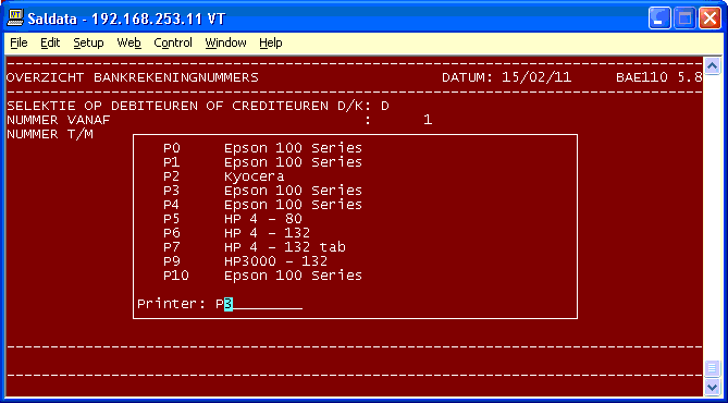 - Keuze: Selectie op debiteuren of crediteuren D/K. Maak de gewenste keuze. - Keuze: Nummer debiteur cq. crediteur vanaf. - Keuze: Nummer debiteur cq. crediteur t/m. - Keuze: Printernummer. Maak een keuze uit één van de printers op het beeldscherm. - Keuze: INGAVES GOED? <RETURN>/<N>. Maak de juiste keuze.Het gewenste overzicht wordt afgedrukt.