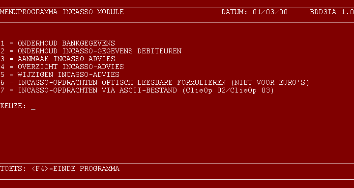 Programmanummer: 227 Omschrijving : INCASSOMODULE Programmanaam : BDD3I0 (Let op, tussen de drie en de nul staat de letter I!)Uiteraard mag het programma ook op een andere plaats in het menu worden opgenomen. Wanneer u met meerdere bedrijven werkt, moet dit programma in elk bedrijf afzonderlijk in het menu worden geplaatst.
