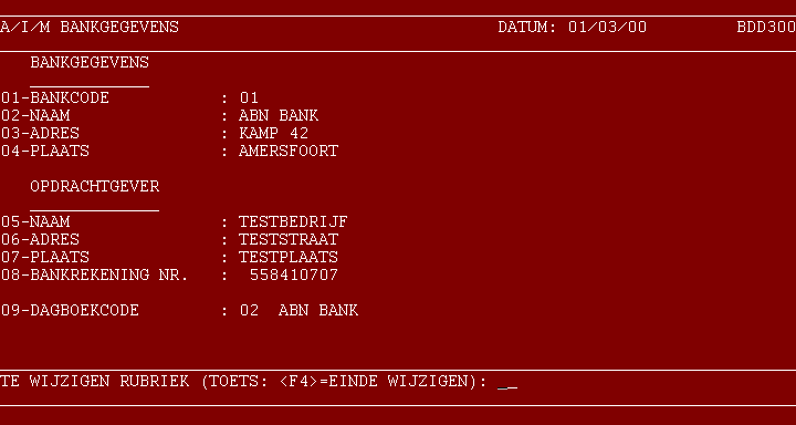 - Naam van de bank; - Adres van de bank; - Plaats van de bank; - Naam van de opdrachtgever; - Adres van de opdrachtgever; - Plaats van de opdrachtgever; - Bankrekeningnummer (moet voldoen aan de zgn. 11-proef) waarop het bedrag geboekt moet worden. Maakt u gebruik van de 'ClieOp 02' of 'ClieOp 03'-indeling dan is het mogelijk om via het bankgiro-circuit ook een incasso op een rekening bij de postbank uit te voeren. Ook is de mogelijkheid aanwezig om een incasso-diskette naar de postbank te sturen, waarbij de ontvangen bedragen op een rekening bij de postbank worden gestort. Het veld 'Bankrekeningnummer' moet in dat geval met de <F1>-toets ingegeven worden. Het programma voert dan geen '11-proef' op het rekeningnummer uit. - Dagboekcode (1 t/m 19 of 50 t/m 99) van de betreffende bank. Het dagboek moet met programma A/I/M Dagboeken aan- gemaakt zijn.Werkwijze: Onderhoud incassogegevens debiteuren