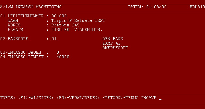 - Bankcode (dat is de verwijzing via welke bank de incas- so voor deze debiteur loopt, moet via 'Onderhoud bank- gegevens' aangemaakt zijn); - Aantal incassodagen (dat is het aantal dagen na de fac- tuurdatum waarin de incasso nog niet plaats mag vinden); - Incassolimiet (dat is het maximale incasso-bedrag per 'run', dat met de debiteur afgesproken is).Binnen dit programma vindt geen controle plaats of bij de betreffende debiteur een goed bankrekeningnummer of een gironummer aanwezig is. Bij de verwerking van de incasso-opdrachten zal in zo'n geval geen incasso plaatsvinden en een melding op de foutenlijst afgedrukt worden.