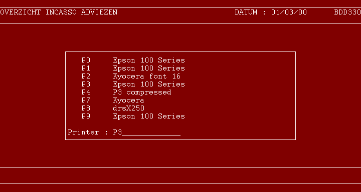 Met dit programma kan een overzicht van de voor incasso geselecteerde facturen afgedrukt worden. Na de start van het programma wordt alleen om het printernummer gevraagd. Daarna verloopt het programma automatisch.