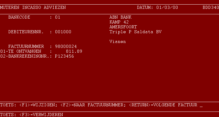- Bankcode; - Debiteurnummer (zoeken via de zoeksleutel kan via de <F3>-toets gestart worden); - Factuurnummer (via de <F1>-toets kan de eerstvolgende com- binatie van bankcode/debiteurnummer/factuurnummer opge- zocht worden).Per incasso-opdracht kan gekozen worden voor wijzigen van bedrag en/of rekeningnummer, terug naar factuurnummer, incasso-opdracht verwijderen of volgende opdracht ophalen. Bij een gironummer wordt een P voor het nummer afgebeeld.
