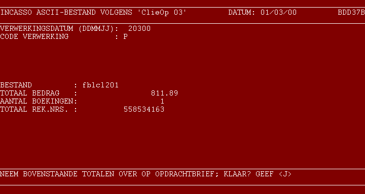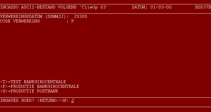 - ZIJN VORIGE INCASSO-OPDRACHT-BESTANDEN VEILIG GESTELD? <J>/<N> Omdat de eventuele vorige bestanden overgeschreven worden, wordt gevraagd of deze naar een PC zijn overgebracht. Met <N> kan het programma afgebroken worden. - BESTANDEN WORDEN VERWIJDERD; DOORGAAN? <J>/<N> Met het antwoord J worden alle oude incasso-bestanden verwijderd. Met antwoord N kan het programma afgebroken worden.