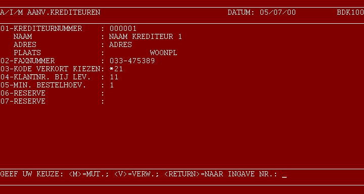 Met dit programma kunt u per crediteur een aantal aanvullende gegevens invoeren of wijzigen. Deze gegevens zijn nodig om bestelkaartjes voor de leveranciers te kunnen maken met programma 407 (Bestellingen) of met de inkoopmodule.