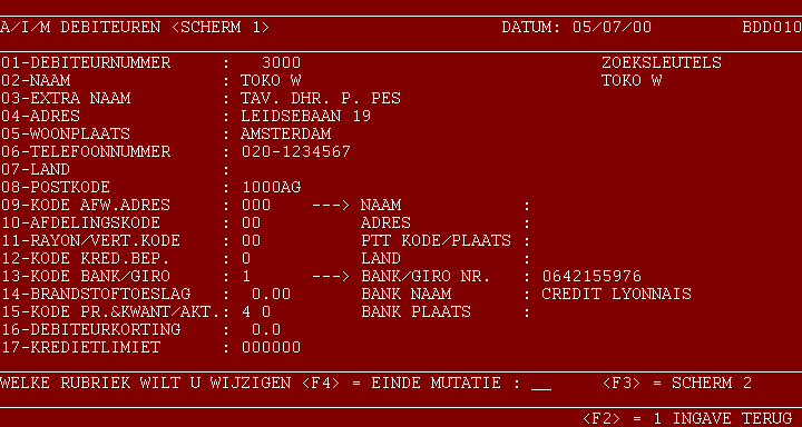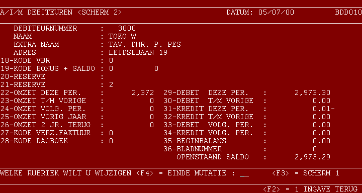 1 - Debiteurnummer 6 N Het debiteurnummer is bij het aanmaken van een nieuwe debiteur vrij te kiezen. Het kan niet gewijzigd worden. 2 - Naam 23 A U kunt twee zoeksleutels van ieder maximaal 9 posities ingeven. U start een zoeksleutel door op de gewenste plaats <F1> te geven. Na maximaal 9 tekens moet u de zoeksleutel met <F3> afsluiten. U kunt het veld daarna aanvullen. De zoeksleutels worden rechts in het scherm getoond. 3 - Extra naam 23 A 4 - Adres 23 A 5 - Woonplaats 17 A U kunt één zoeksleutel van maximaal 9 posities ingeven. 6 - Telefoonummer 12 A 7 - Land 17 A 8 - Postcode 6 A U kunt de hele postcode of een deel daarvan als zoek- sleutel ingeven. 9 - Code afwijkend 3 N adres U kunt hier de code van een 'vast' afwijkend adres ingeven: 000: Geen afwijkend adres; 100: Afwijkend factuuradres; 200: AFwijkend verzendadres. Na keuze 100/200 kunnen de NAW-gegevens en land op gelijke wijze als de rubrieken 2, 4, 8, 5 en 7 worden ingebracht. Tijdens de orderinvoer kan, per order, alsnog een afwijkend adres worden ingevoerd. 10 - Afdeling 2 N De afdelingscode kunt u gebruiken om de debiteuren naar eigen inzicht te groeperen in overzichten, zie daarvoor 215 Debiteurenlijsten. Bij het invoeren van verkoop- en balansfacturen verschijnt deze code en kan daar per openstaande post alsnog gewij- zigd worden. Deze code kan dan gebruikt worden om indi- viduele openstaande posten in een andere afdeling te plaatsen. 11 - Code rayon/vert. 2 N Deze code geldt als selectiecriterium voor diverse de- biteurgerichte overzichten, zie programma's 215, 516 en 518. Tijdens de orderinvoer kan per order een afwijkende code worden toegekend. 12 - Code kredietbep. 1 N 0: kredietbeperking berekenen; 1: geen kredietbeperking. De berekening vindt plaats tijdens de facturering. Tijdens de orderinvoer kan, per order, van deze code worden afge- weken. 13 - Code bank/giro 1 N 0: Geen bank of giro 1: Bankrekening 2: Girorekening 3: Gemeentegiro Na ingave kan een bank-/gironummer van 10 posities worden ingegeven. Bij bank tevens de banknaam (23 posities) en bankplaats. Zie ook de incassomodule. 14 - Brandstof- 2 D 2 toeslag Per order kan een afwijkende toeslag worden ingegeven, zie programma 500 (Order invoer) 15 - Code prijs- 2 N kwantum/actie Deze rubriek heeft een dubbele functie: 1e positie = prijskode 2e positie (na spatie) = kwantum en/of actiecode (0 = prijs 0) (0 = kwantum en/of actiecode) (1 = prijs 1) (1 = geen kwantum/actie) (2 = prijs 2) (2 = kwantum) (3 = prijs 3) (3 = beide) (4 = prijs 4) zie ook programma 400, rubrieken 6 t/m 10; zie ook programma 402, (A/I/M Staffelprijzen) en zie ook programma 500, beschrijving "bepalen prijs en kortingen". 16 - Debiteuren- 2 D 1 korting Zie ook programma 500, beschrijving "bepalen prijs en kortingen". 17 - Kredietlimiet 5 N Tijdens orderinvoer vindt melding plaats bij overschrijding. 18 - Code VBR 1 N Voorheffing Berekening Retouremballage: 0: VBR berekenen, gekoppeld aan emballage 1: VBR ingeven 2: geen VBR zie ook programma 400, code emballage zie ook programma 500, beschrijving "Emballage" 19 - Code bonus 1 N punten 0: geen bonuspunten tellen 1: wel bonuspunten tellen Eventueel kan hier een saldo bonuspunten (5 N) worden inge- geven. De bonuspunten worden berekend tijdens facturering. Zie ook programma 400, aantal bonuspunten en programma 500, beschrijving "Eenmalige (gratis) artikelen". 20 - Reserve 21 - Reserve 22 - Omzet deze periode 23 - Omzet t/m vorige periode 24 - Omzet volgende periode 25 - Omzet vorig jaar 26 - Omzet 2 jaar terug 27 - Code verzamel- 1 N factuur 0: per order een factuur 1: meerdere orders per factuur 28 - Code dagboek 1 N Deze code verwijst naar één van de systeemdagboeken die voor de debiteurenadministratie kunnen worden ge- bruikt, zowel bij handmatige als bij de automatische facturering. Code Systeemdagboek 0 20 en 24 1 21 en 25 2 22 en 26 3 23 en 27 De systeemdagboeken 20 - 23 worden gebruikt bij de handmatige facturering, systeemdagboeken 24 - 27 voor de automatische facturering. Voor meer informatie: zie de beschrijving van de grootboekadministratie 29 - Debet deze periode 30 - Debet t/m vorige periode 31 - Credit deze periode 32 - Credit t/m vo- rige periode 33 - Debet volgende periode 34 - Credit volgende periode 35 - Beginbalans Het saldo aan het begin van het boekjaar (eindsaldo van de openstaande posten vorig boekjaar). 36 - Bladnummer Geeft het bladnummer van het laatste rekeningkaartje dat bij een periode-afsluiting is afgedrukt; deze rubriek kunt u ter informatie en controle gebruiken.Indien u gebruik maakt van de Btw- en Iris-module, dan kunnen in aparte 'schermen' de Btw- en Iris-gegevens van de debiteur ingevoerd worden.