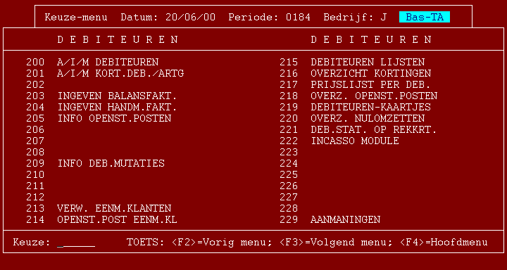 De hierboven niet genoemde programma's zijn standaardprogramma's die ook door andere pakketten gebruikt worden. Deze programma's worden niet in deze handleiding beschreven, maar kunt u vinden in de beschrijving van de debiteurenmodule in het Kavta-pakket, debiteurenmodule in het Basta-pakket en in de incassomodule.