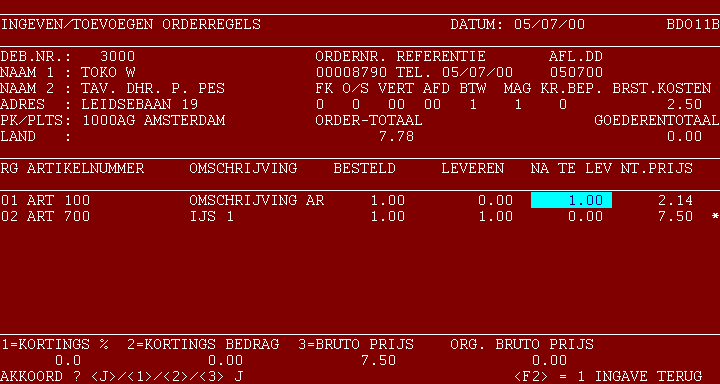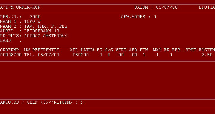 Na het bepalen van de debiteur en het ingeven van het betreffende ordernummer verschijnen de kopgegevens op het scherm, waarna het, op dezelfde wijze als bij keuze "fout" na het invoeren van een nieuwe order, mogelijk is de gegevens te wijzigen.
