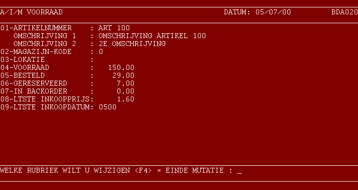 - Er zijn meerdere voorraadmagazijnen per artikel mogelijk; - Er zijn alleen records (=ruimte) nodig voor artikelen waarvan voorraad moet worden bijgehouden.Het programma start met de mededeling, dat met dit programma voorraden ingegeven of gecorrigeerd kunnen worden, zonder financiële gevolgen. Moet ook de voorraadwaarde in het grootboek aangepast worden, dan moet u deze of apart via het algemeen boekingsprogramma verwerken of u moet via programma 410 de voorraad boeken. Gebruik dit programma dan ook alleen als geen andere optie meer gebruikt kan worden om de onderstaande velden te corrigeren. Gebruikt u ook het beveiligingspakket, geef dan aan dit programma een zeer hoge prioriteit (bijvoorbeeld 9), zodat alleen de systeembeheerder dit programma kan gebruiken.