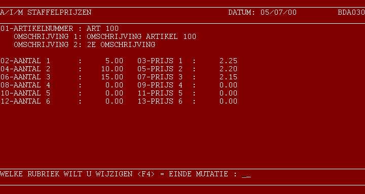 1 - Artikelnummer 17 A Het artikelnummer dient in het stambestand aanwezig te zijn. Ook is het mogelijk het artikel via een zoeksleutel te bepalen. Weergave van omschrijving 1 (en 2). Artikelen kunnen ook via een zoeksleutel worden bepaald. U kunt tevens door het ingeven van het betreffende crediteurennummer als zoeksleutel alle artikelen voor die crediteur op het scherm oproepen. 2 - Aantal 1 5 D 2 Eerste staffelaantal. 3 - Prijs 1 5 D 2 Prijs behorende bij eerste staffelaantal. 4 - Aantal 2 5 D 2 Tweede staffelaantal. 5 - Prijs 2 5 D 2 Prijs behorende bij tweede staffelaantal. t/m 12 - Aantal 6 5 D 2 Zesde staffelaantal. 13 - Prijs 6 5 D 2 Prijs behorende bij zesde staffelaantal.