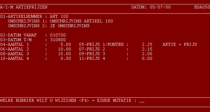 1 - Artikelnummer 17 A Het artikelnummer dient in het stambestand aanwezig te zijn. Ook is het mogelijk het artikel via een zoeksleutel te bepalen. Weergave van omschrijving 1 (en 2). Artikelen kunnen ook via een zoeksleutel worden bepaald. U kunt tevens door het ingeven van het betreffende crediteurennummer als zoeksleutel alle artikelen voor die crediteur op het scherm oproepen. 2 - Datum vanaf 6 N Start van de actie. 3 - Datum t/m 6 N Einde van de actie. 4 - Aantal 1 5 D 2 Eerste staffelaantal. 5 - Prijs 1 5 D 2 Prijs behorende bij eerste staffelaantal. t/m 10 - Aantal 4 5 D 2 Vierde staffelaantal. 11 - Prijs 4 5 D 2 Prijs behorende bij vierde staffelaantal.