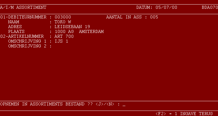 1 - Debiteurnummer 6 N Het debiteurnummer dient in het stambestand aanwezig te zijn. Ook is het mogelijk de debiteur via een zoeksleutel te bepalen. Weergave van NAW-gegevens en het aantal reeds in assortiment aanwezige arti- kelen (maximaal 999 artikelen per assortiment toe- gestaan). 2 - Artikelnummer 17 A Dient in het artikelstambestand aanwezig te zijn. Bepaling van artikel ook via zoeksleutels mogelijk. Weergave van omschrijving 1 (en 2).Volg verder de aanwijzingen op het scherm en de vragen die door het programma worden gesteld.