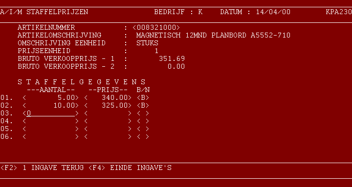 Met programma 432 kunt u per artikel staffelprijzen in maximaal 6 staffels vaststellen, wijzigen en/of verwijderen. Per staffel kunt u aangeven of deze als bruto prijs of als netto prijs verwerkt moet worden. Dit is echter ook nog afhankelijk van het trefwoord KORTING.