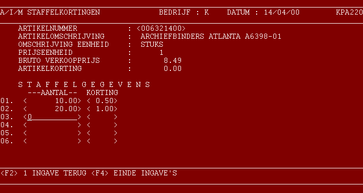 Met programma 433 kunt u per artikel staffelkortingen in maximaal 6 staffels vaststellen, wijzigen en/of verwijderen.