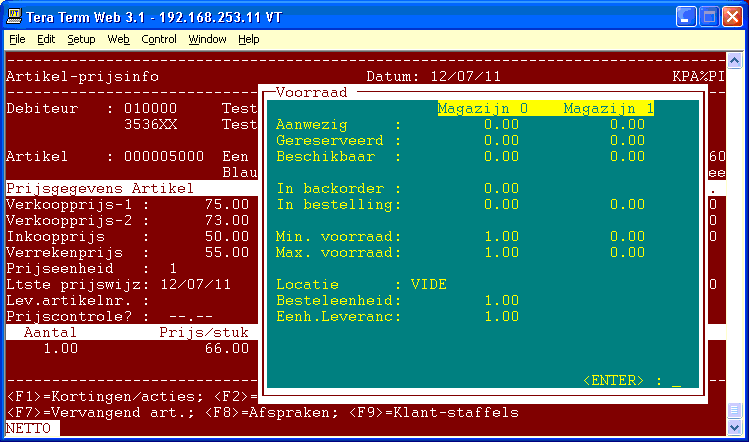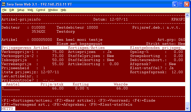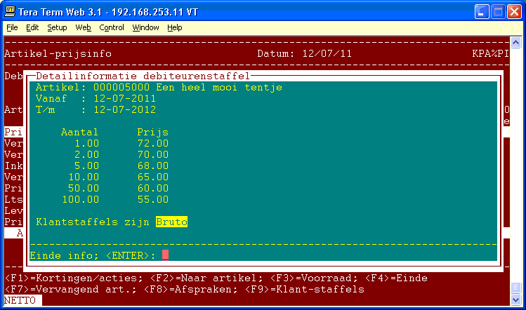 Programma 437 toont per artikel verkoop- en inkoopprijzen, kortingen, verrekenwaarde en -prijs. Als u een debiteur heeft ingevoerd kunt u bovendien door het ingeven van een aantal direct zien wat bij dat aantal de geldende prijs per stuk en de totaalprijs voor die debiteur is.