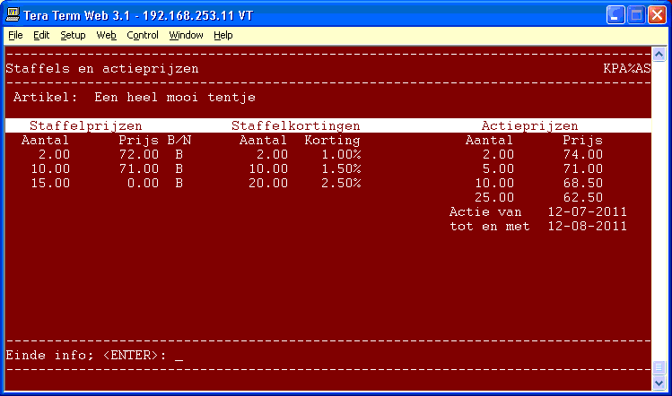 - Aktieprijzen: looptijd, staffels en prijzen - Staffelprijzen: aantallen en prijzen, bruto/netto - Staffelkortingen: aantallen en percentages - Bruto verkoopprijs 1 en 2 - Verrekenprijs - Inkoopprijs - Percentage artikelkorting - Percentage verrekenprijsAls u een debiteurennummer heeft ingegeven verschijnen bovendien: