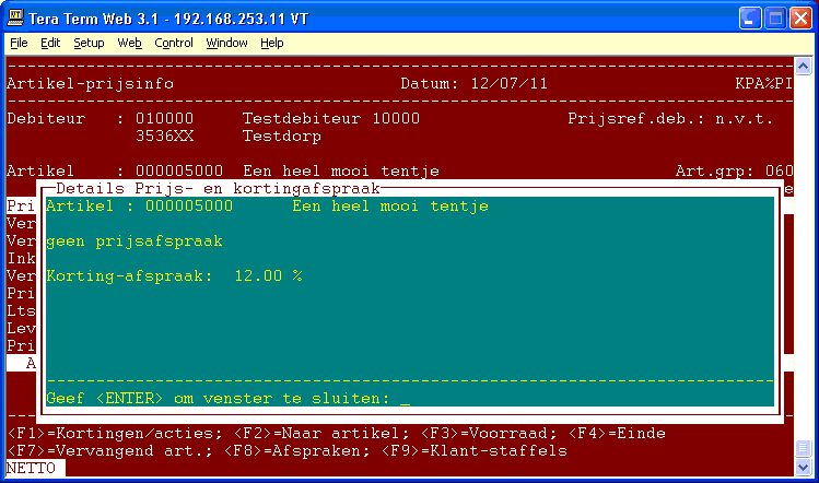 Werkwijze Start programma 437. 1 - Debiteur Geef het debiteurnummer of een zoeksleutel met <F3> in. Met <F1> krijgt u alleen artikelinformatie. Op het scherm worden de NAW-gegevens van de debiteur vermeld. 2 - Artikel Geef het artikelnummer of een zoeksleutel. De prijs- en kortingsgegevens worden nu op het scherm gezet, plus de artikelomschrijving. Met <F1> kunt u, als u een debiteurennummer heeft ingegeven, de artikelgroepskortingen voor deze debiteur raadplegen. 3 - Aantal Als een debiteur ingegeven is, kunt u nu een aantal ingeven, waarna de prijs per eenheid en de totale waarde getoond wordt. Via artikelnummer en <F2> kunt u teruggaan naar het debiteurennummer en daar eventueel stoppen met <F4>.