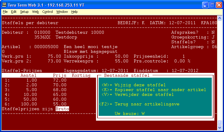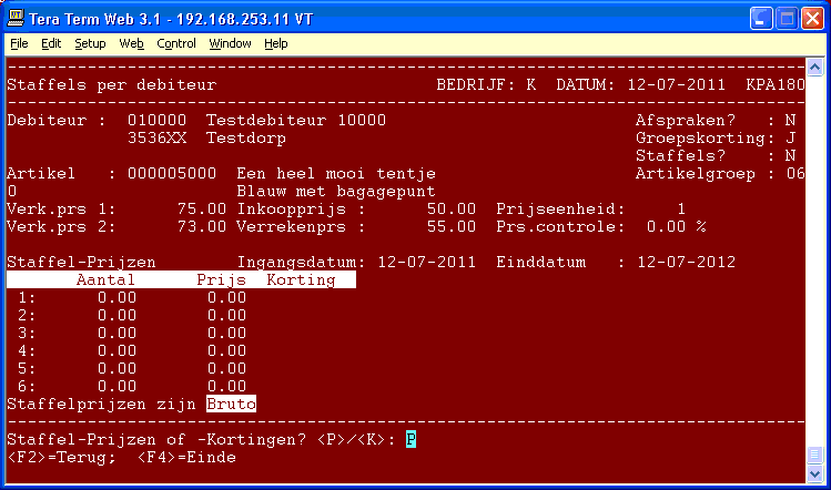 Werkwijze Start programma 440. 1 - Debiteur Geef het debiteurennummer of een zoeksleutel in. De naam van de debiteur wordt op het scherm gezet. 2 - Artikel Geef het artikelnummer of een zoeksleutel in. U kunt zoeken met o.a. de catalogussleutel of het leveranciersartikelnummer. De omschrijving van het artikel en de prijseenheid worden op het scherm gezet. 3 - Invoeren Geef in of het een prijs of een korting betreft. U kunt nu in maximaal 6 staffels de aantallen en actieprijzen of actiekortingen ingeven. De staffelaantallen zijn ondergrenzen, de prijzen gelden voor de prijseenheid van het artikel. Na ingave van de staffeltabel kunt u de begin- en einddatum ingeven. Tevens kunt u aangeven of dit een bruto of netto actie betreft. Bevestig de ingevoerde gegevens. Staffelgegevens akkoord? <J>/<N>: Na antwoord N kunt u rubrieken muteren, na antwoord J wordt deze actie opgenomen, en keert het programma terug naar de ingave van het artikelnummer. Daar kunt u dan een volgende actie invoeren, muteren of verwijderen, of met <F4> het programma beëindigen. 4 - Wijzigen, Kopieeren en Verwijderen Na het ingeven van het debiteur- en artikelnummer worden de gegevens van de prijsaktie op het scherm gezet. Hierna kunt u kiezen voor een kopie, wijzigen of verwijderen.5 - Wijzigen Per rubriek kunt u nu de ingegeven waarden wijzigen. Met <F4> kunt u het muteren beëindigen. Zie verder bij Invoeren. 6 - Verwijderen Na deze keuze volgt nog een controlevraag. 7 - Kopieer Geef het artikelnummer of een zoeksleutel voor de kopie in. U kunt zoeken met o.a. de catalogussleutel of het leveranciersartikelnummer. Hierna komt u weer terug bij de keuze wijzig, kopieer of verwijder om een volgende kopie te kunnen maken.