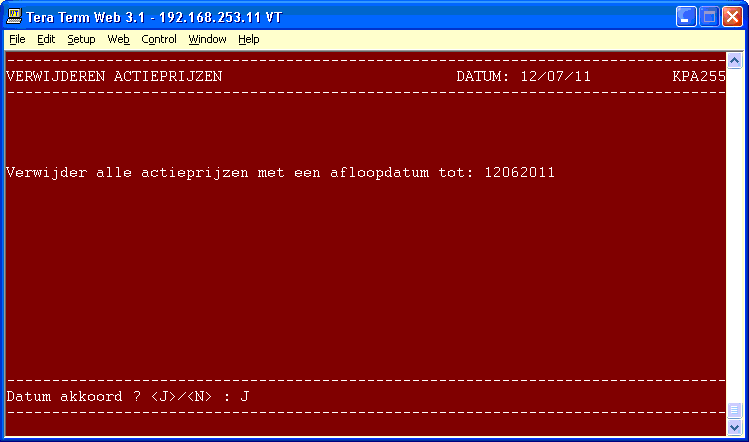 Met programma 446 kunt u alle actieprijzen met een looptijd die eindigt voor een in te geven datum verwijderen. Wilt u slechts één van meerdere prijsacties verwijderen, gebruik dan A/I/M Actieprijzen.