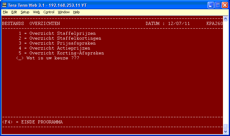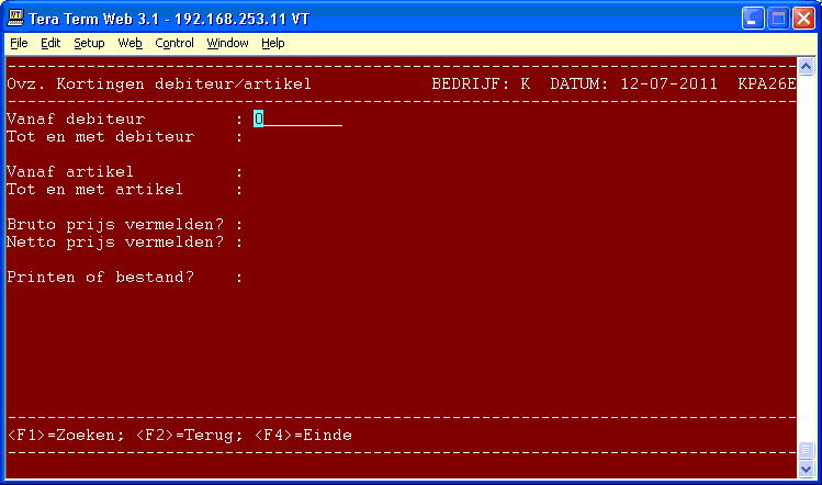 3 - Printerkeuze Kies de printer waarop u het overzicht wilt afdrukken. Default (<RETURN>) is de printer die u met programma 616 A/I/M Systeemparameters voor het debiteurenmenu heeft gekozen. Na het afdrukken van het overzicht keert u terug naar de ingave van de selectie. U kunt dan een volgende selectie ingeven of met <F2> naar de keuze van het overzicht teruggaan. Bij de keuze voor een overzicht van de prijsafspraken per debiteur keert u altijd terug naar de keuze van het overzicht. Daar kunt u met <F4> het programma verlaten.