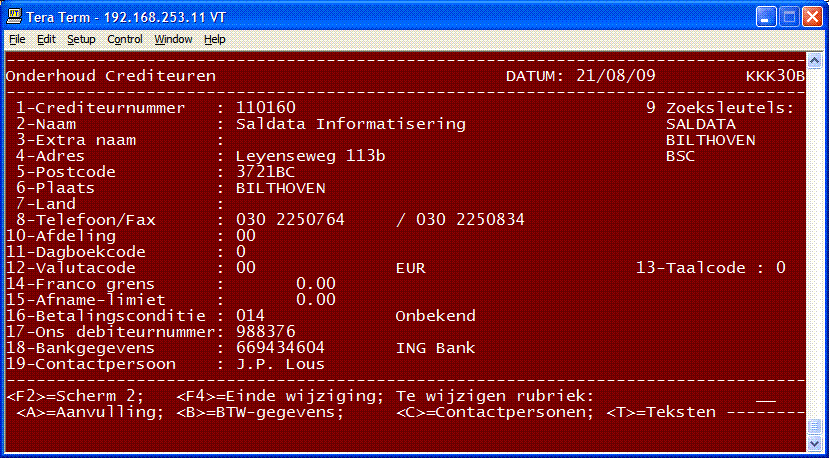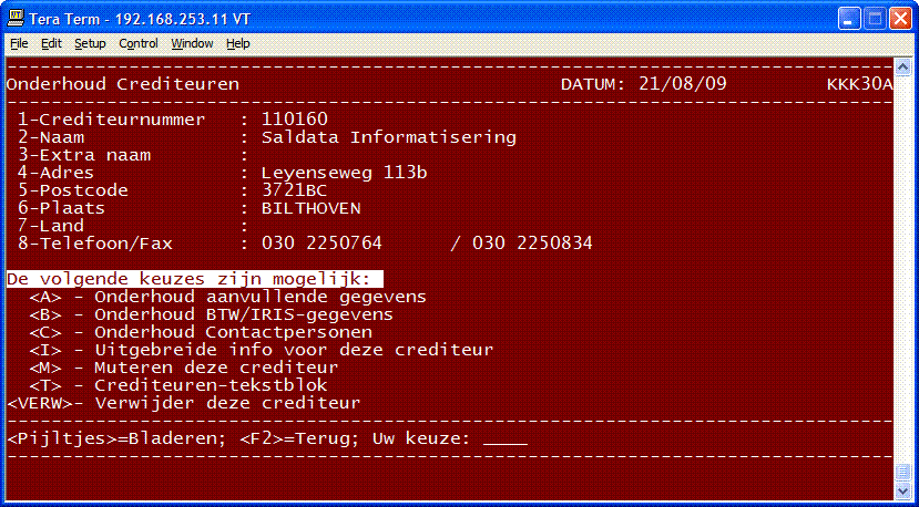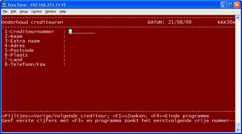 In programma 300 roept u een bestaande crediteur op door diens nummer in te geven, of door deze met één van de zoeksleutels te zoeken.
