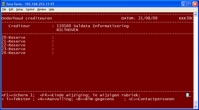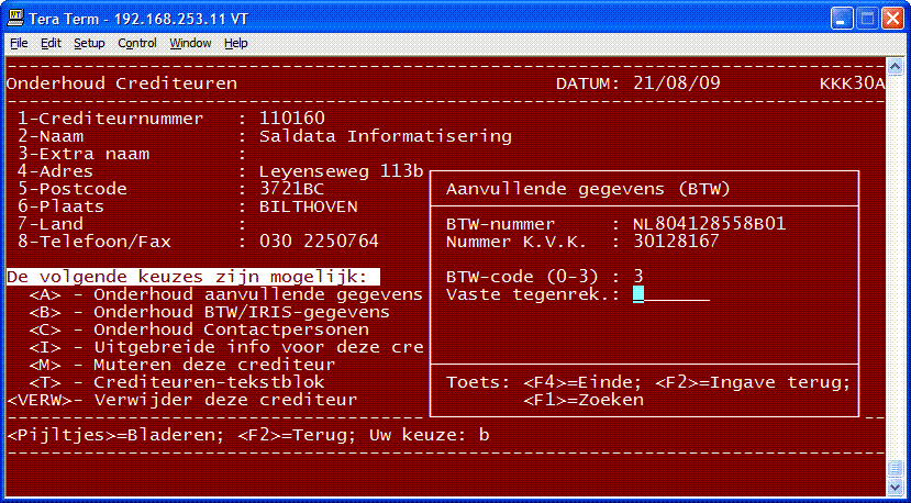 <B> Onderhoud Btw/Iris-gegevens Wanneer u gebruik maakt van de Btw- en Iris-module, dan kunnen in aparte 'schermen' de hiervoor benodigde gegevens worden onderhouden. Bij de Btw-gegevens gaat het om het btw-nummer van de crediteur en diens eventuele nummer bij de Kamer van Koophandel (KvK). Komt de crediteur uit een ander EU-land, dan moet u het btw-nummer invullen; bij Nederlandse relaties dient u minimaal NL als btw-nummer in te vullen. Verzuimt u dit dan kan de crediteur door het systeem worden beschouwd als afkomstig van buiten de EU. Ook kunt u hier een BTW-code ingeven, waarmee u aangeeft wat het bij deze crediteur meest voorkomende BTW-tarief is: 0 - Geen 1 - Extra percentage 2 - BTW Laag 3 - BTW Hoog Met deze code wordt de (voorstel)waarde van de btw-grondslag berekend bij het inboeken van binnengekomen facturen. Eveneens bij het boeken van crediteurenfacturen wordt uit de BTW-gegevens de tegenrekening (als voorstelwaarde) overgenomen. Deze vaste tegenrekening (denk bijvoorbeeld aan periodiek terugkerende kosten) geeft u per crediteur eveneens in bovenstaand scherm in. Bij de Irisgegevens gaat het om de vervoerstak-code, een eventuele haven van lossing en de keuze of u deze gegevens al dan niet wilt kunnen wijzigen tijdens een boeking. Verdere informatie hierover vindt u in de handleiding van de Btw-module en de Iris-module. Als u klaar bent met deze gegevens keert u weer terug. <C> Onderhoud Contactpersonen U kunt per crediteur maximaal 100 contactpersonen vastleggen, met voor elke contactpersoon een veelheid aan rubrieken, zoals Naam, Afdeling, Telefoonnummer en Email-adres. Een groot deel van de rubrieken kunt u naar eigen inzicht benoemen en gebruiken, evenals bij de Aanvullende gegevens. Deze functionaliteit is eveneens voor Debiteuren beschikbaar en wordt elders behandeld. Wanneer u Inkooporders wilt laten mailen vanuit Kavta, gebruikt u daarvoor ook de gegevens van een contactpersoon. Na het onderhouden van de contactpersonen keert u weer terug. <I> Uitgebreide info Wanneer u hiervoor kiest wordt programma 300 beeindigd en gaat u automatisch door naar programma 306. <M> Muteren deze crediteur Met de <M> krijgt u de mogelijkheid om de stamgegevens uit de basis-schermen te wijzigen. Ook de schermen met aanvullende gegevens kunnen worden gewijzigd. Wanneer u klaar bent met het wijzigen van de gegevens van deze relatie kunt u met de <F4>-toets de gewijzigde gegevens opslaan en keert u terug naar het begin van het programma: het ingeven van een crediteurnummer. <T> Crediteurentekstblok In het crediteurentekstblok heeft u de beschikking over een soort kladblok waarin u groot aantal regels vrije tekst kwijt kunt per klant. Meer informatie vindt u in de beschrijving van het vergelijkbare debiteuren-kladblok. Na uw uitstapje naar het tekstblok keert u weer terug. <VERW> Verwijder de crediteur U kunt een crediteur uit het systeem verwijderen onder bepaalde voorwaardes: - Er mogen geen openstaande posten aanwezig zijn voor deze crediteur. - Er mag in het lopende boekjaar niet op deze relatie zijn geboekt. - Er mogen geen inkooporders voor deze crediteur open staan. - Er mag dit jaar geen omzet zijn geboekt op deze leverancier. - De betreffende relatie mag niet als standaard-crediteur zijn aangemerkt. Als aan één van deze eisen niet is voldaan kan de crediteur niet uit het systeem worden verwijderd. Verdere controles U kunt de crediteur wel verwijderen als er omzet was in het voorgaande jaar (of daarvoor); het programma zal u echter wel waarschuwen: Heeft u er voor gekozen een crediteur te verwijderen, dan zal het programma u nog minstens één maal om bevestiging van uw keuze vragen. Nadat de relatie door het programma is verwijderd, keert u terug naar het begin van het programma.- Terug naar bovenHet eerste scherm: de rubrieken