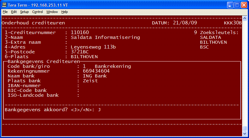 Start programma 300. 1 - Nummer Geef het gewenste crediteurnummer in, of laat het programma een vrij nummer zoeken, volgens de hierboven beschreven methode, met behulp van de <F3>-toets. 2 - Gegevens Breng de adresgegevens in, zoeksleutels en overige, in het eerste scherm gevraagde, rubrieken. Bij het invullen van de bankgegevens verschijnt daarvoor een apart'window' in uw scherm. Wanneer u bij het invullen van een rubriek een stap 'terug'wilt doen, kunt u in de regel met de <F2>-toets terug naar de vorige rubriek. 3 - Bevestig Het programma vraagt u of de gegevens in dit scherm juist zijn. Wanneer u niet akkoord gaat (N) keert u terug naar de laatste rubriek van het eerste scherm. Antwoordt u J , dan wordt de nieuwe crediteur opgeslagen en gaat u naar het tweede scherm. Deze relatie wordt verder behandeld als een reeds bestaande crediteur en u kunt desgewenst rubrieken wijzigen.- Terug naar boven