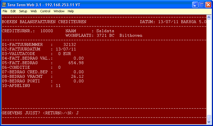 Crediteurnummer 6 N / 9 A U kunt zoeken via één bij de crediteur opgegeven zoeksleutel. Na ingave van een crediteurnummer vraagt het programma of deze crediteur de juiste is, geef <RETURN> of N. Heeft u een zoeksleutel ingegeven, dan verschijnt een scherm waarin u kunt zoeken naar de gewenste crediteur. Geef de code (1 - 13) die aan het be- gin van de regel met de gewenste crediteur staat om die te selecteren. Via functietoetsen (zie on- derin het betreffende scherm) kunt u verder zoe- ken, terugzoeken, terug naar het crediteurnummer of de eerste regel selecteren. 1 - Factuurnummer 8 N Een factuurnummer mag maar één keer voorkomen. 2 - Factuurdatum DDMMJJ Default (<RETURN>) is de huidige datum. 3 - Valutacode 2 N Met deze code bepaalt u of u het factuurbedrag in de basisvaluta wilt ingeven, of in de gewenste valuta. Valutacodes kunt u ingeven met programma 108 A/I/M Valuta. Default (<RETURN>) is valutacode '00'. 4 - Factuurbedrag 7 D 2 in valuta Wanneer de valutacode niet '00' is, dan kan het bedrag in valuta ingegeven worden. Het programma rekent het bedrag om naar de basisvaluta. 5 - Factuurbedrag 7 D 2 in basisvaluta 6 - Conditie 2 N U bepaalt hier welke betalingsconditie voor deze factuur geldt. Default (<RETURN>) is conditie '00'. 7 - Kredietbeperking 7 D 2 8 - Bedrag vracht 7 D 2 9 - Bedrag porti 7 D 2 10 - Afdeling 2 N Wordt default gevuld met de afdeling uit de stam- gegevens. U kunt een andere afdeling ingeven, zo- dat deze openstaande post bij die afdeling wordt opgenomen. Bevestiging Na invoeren van bovenstaande rubrieken vraagt het programma: GEGEVENS JUIST? <RETURN>/<N> Wanneer dit niet het geval is kunt u de rubrie- ken wijzigen.
