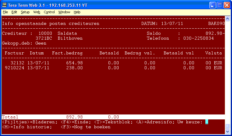 - Crediteurnummer - Een aantal crediteurgegevens zoals naam, adres, woonplaats en telefoonnummer - Het saldo van de crediteur - Per openstaande post: Factuurnummer Datum Factuurbedrag Betaald bedrag Factuurbedrag in valuta Betaald bedrag in valuta Valutacode