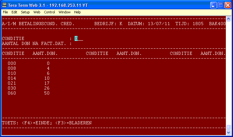 Werkwijze Start programma 312. Onder in het scherm verschijnen de al aanwezige condities en het daaraan gekoppelde aantal dagen. 1 - Conditie Geef het conditienummer in. Met functietoets <F3> kunt u verder door de condities bladeren of met <F4> kunt u het programma verlaten en terugkeren naar het menu. Bij een bestaande conditie vraagt het programma of de conditie gewijzigd of verwijderd moet wor- den. Maak de gewenste keuze. 2 - Aantal dagen Geef het aantal dagen in dat bij de condi- tie hoort. Na een keuze of de ingave goed is wordt de conditie in het bestand opgenomen.