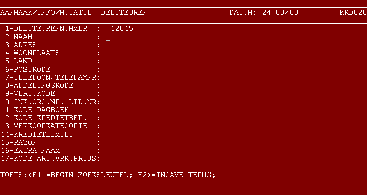 Van elke nieuw in het systeem op te nemen debiteur moeten de stamgegevens worden vastgelegd. De primaire sleutel van de stamgegevens wordt gevormd door het debiteurennummer: deze is vrij te kiezen. Daarnaast kunt u (secundaire) zoeksleutels inbouwen: twee zoeksleutels op de naam, één op de postcode en één op de woonplaats. De betekenis van de diverse velden vindt u in de beschrijving per rubriek.