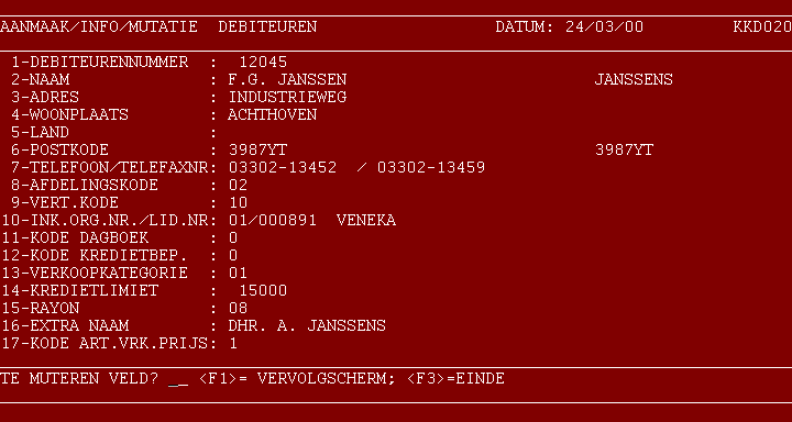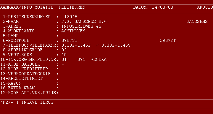 Inhoud U kunt alle rubrieken van het debiteurenstambestand op het scherm raadplegen. Werkwijze Start programma 200. 1 - Debiteurnummer Geef het debiteurnummer in of maak gebruik van een zoeksleutel. Als u een zoeksleutel heeft inge- geven, dan verschijnt een zoekscherm. Via de ingave van het twee-cijferige nummer dat voor het debiteurnummer staat kunt u een debiteur selecteren. Via functietoets <F3> kunt u verder zoeken, via <F1> kunt u terugzoeken of via <F2> kunt u terug naar de ingave van het debiteur- nummer. Via functietoets <F4> kunt u dit programma ver- laten en terugkeren naar het menu van waaruit dit programma werd opgestart. 2 - Keuzescherm Kies in het keuzescherm de functie I (info) of ga met <RETURN> terug naar de ingave van het debiteurnummer. 3 - Gegevensscherm Het eerste scherm met stamgegevens wordt getoond. Per scherm met functietoets <F4> terug naar ingave van het debiteurnummer of met <RETURN> naar het volgende scherm. Als laatste info-scherm wordt het scherm met financiële gegevens getoond. AANVULLENDE INFO? <J>/<N>: Geef N om terug te gaan naar de ingave van het debiteurnummer of J om het volgende scherm te tonen. De eventuele schermen met de gegevens van de Btw- en Iris-module worden getoond. Met <RETURN> wordt ieder scherm afgesloten. Na het laatste scherm terug naar de ingave van het debiteurnummer.Inhoud en betekenis van de meest gebruikte rubrieken
