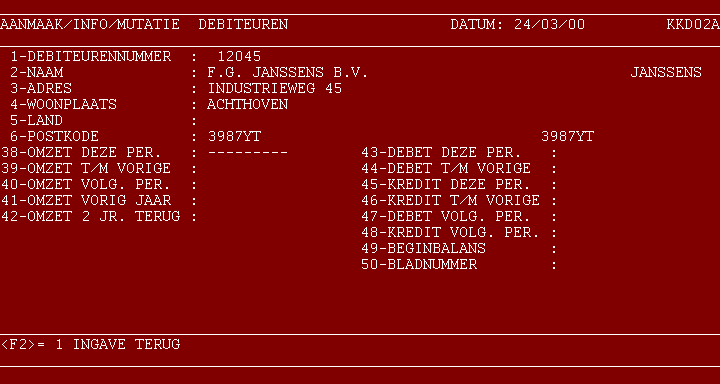 Zorgvuldig invoeren Voer onderstaande gegevens zorgvuldig in; na het in- voeren kunnen deze gegevens niet meer gewijzigd worden. De saldigegevens dienen via de boekingsprogramma's te ontstaan. Verwijderen van een debiteur is alleen mogelijk nadat door middel van die programma's de gegevens op nul gesteld zijn. 38 - Omzet deze 8 N periode 39 - Omzet t/m vorige 8 N periode 40 - Omzet volgende 8 N periode 41 - Omzet vorig jaar 8 N 42 - Omzet 2 jaar 8 N terug Velden 17 t/m 21 invoeren als geheel getal, eventuele decimalen worden afgerond. 43 - Debet deze 8 D 2 periode 44 - Debet t/m vorige 8 D 2 periode 45 - Credit deze 8 D 2 periode 46 - Credit t/m vo- 8 D 2 rige periode 47 - Debet volgende 8 D 2 periode 48 - Credit volgende 8 D 2 periode 49 - Beginbalans 8 D 2 Het saldo aan het begin van het boekjaar (eindsaldo van de openstaande posten vorig boekjaar). 50 - Bladnummer 4 N Geeft het bladnummer van het laatste rekeningkaartje dat bij een periode-afsluiting is afgedrukt; deze rubriek kunt u ter informatie en controle gebruiken.Indien u gebruik maakt van de Btw- en Iris-module, dan kunnen in aparte 'schermen' de Btw- en Iris-gegevens van de debiteur ingevoerd worden.