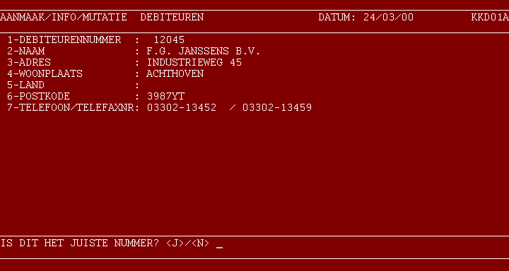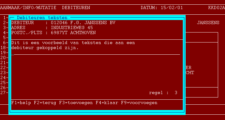 Werkwijze Start programma 200. 1 - Debiteurnummer Geef het debiteurnummer in of maak gebruik van een zoeksleutel. Als u een zoeksleutel heeft inge- geven, dan verschijnt een zoekscherm. Via de ingave van het twee-cijferige nummer dat voor het debiteurnummer staat kunt u een debiteur selecteren. Via functietoets <F3> kunt u verder zoeken, via <F1> kunt u terugzoeken of via <F2> kunt u terug naar de ingave van het debiteur- nummer. Via functietoets <F4> kunt u dit programma ver- laten en terugkeren naar het menu van waaruit dit programma werd opgestart. 2 - Keuzescherm Kies in het keuzescherm de functie T (teksten) of ga met <RETURN> terug naar de ingave van het debiteurnummer. 3 - Gegevensscherm U kunt nu maximaal 99 tekstregels invoeren. Deze tekstregels dienen alleen als aantekenigen blok en worden getoond bij info debiteuren en info openstaande posten. Via functietoets <F4> geeft u aan dat u klaar met wijzigen bent. De gegevens worden teruggeschre- ven en het programma keert terug naar stap 1.Muteren debiteuren contactgegevens
