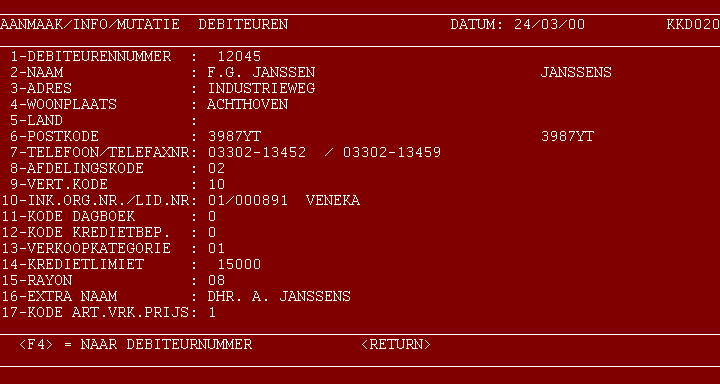 Alleen stamgegevens De stamgegevens van een bestaande debiteur kunt u wijzigen, nadat u deze via het debiteurnummer of één van de zoeksleutels heeft opgeroepen. De financiële gegevens en het bladnummer kunt u niet via dit programma wijzigen. Deze rubrieken worden vanuit de boekingsprogramma's bijgehouden. Werkwijze Start programma 200. 1 - Debiteurnummer Geef het debiteurnummer in of maak gebruik van een zoeksleutel. Als u een zoeksleutel heeft inge- geven, dan verschijnt een zoekscherm. Via de ingave van het twee-cijferige nummer dat voor het debiteurnummer staat kunt u een debiteur selecteren. Via functietoets <F3> kunt u verder zoeken, via <F1> kunt u terugzoeken of via <F2> kunt u terug naar de ingave van het debiteur- nummer. Via functietoets <F4> kunt u dit programma ver- laten en terugkeren naar het menu van waaruit dit programma werd opgestart. 2 - Keuzescherm Kies in het keuzescherm de functie M (muteren) of ga met <RETURN> terug naar de ingave van het debiteurnummer. 3 - Gegevensscherm Geef het nummer van de te wijzigen rubriek in. Via functietoets <F1> kunt u naar het vervolgscherm toe. Via functietoets <F3> geeft u aan dat u klaar met wijzigen bent. De gegevens worden teruggeschre- ven en het programma keert terug naar stap 1. In het volgende scherm gelden dezelfde functietoet- sen, maar met <F1> gaat u naar het scherm met de omzet en financiële gegevens. Deze kunnen niet ge- wijzigd worden. Wel kunt u met <F1> naar de aan- vullende schermen met de btw- en de iris-gegevens gaan. 4 - Wijzigen Wijzig de gekozen rubriek. Het programma gaat daarna terug naar stap 3.Muteren debiteuren teksten