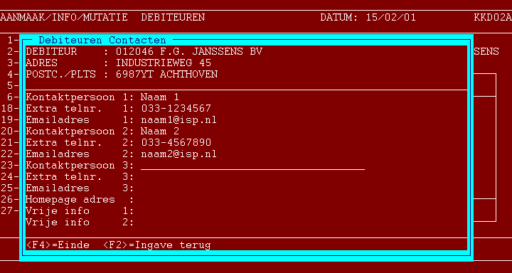 Werkwijze Start programma 200. 1 - Debiteurnummer Geef het debiteurnummer in of maak gebruik van een zoeksleutel. Als u een zoeksleutel heeft inge- geven, dan verschijnt een zoekscherm. Via de ingave van het twee-cijferige nummer dat voor het debiteurnummer staat kunt u een debiteur selecteren. Via functietoets <F3> kunt u verder zoeken, via <F1> kunt u terugzoeken of via <F2> kunt u terug naar de ingave van het debiteur- nummer. Via functietoets <F4> kunt u dit programma ver- laten en terugkeren naar het menu van waaruit dit programma werd opgestart. 2 - Keuzescherm Kies in het keuzescherm de functie C (contactgegevens) of ga met <RETURN> terug naar de ingave van het debiteurnummer. 3 - Gegevensscherm U kunt nu 3 kontaktpersonen met telefoonnummer en email- adres, het homepageadres van de klant en 2 vrije info velden invoeren. Deze gegevens dienen alleen als info en worden getoond bij info debiteuren en info openstaande posten. Via functietoets <F4> geeft u aan dat u klaar met wijzigen bent. De gegevens worden teruggeschre- ven en het programma keert terug naar stap 1.