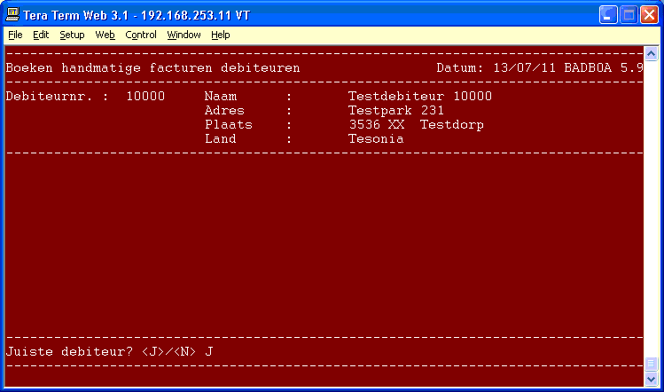 Werkwijze Start programma 204. 1 - Periode Voer de periode in. GEEF BOEKINGSPERIODE/JAAR IN : MMJJ Default (<RETURN>) is de huidige periode. 2 - Gegevens Geef het debiteurnummer in en daarna de overige factuurgegevens. Zie de rubrieksgewijze beschrij- ving. 3 - Afsluiten Na het invoeren van een verkoopfactuur vraagt het programma om een volgend debiteurnummer; u kunt dan een volgende verkoopfactuur invoeren of met functietoets <F4> het programma verlaten.