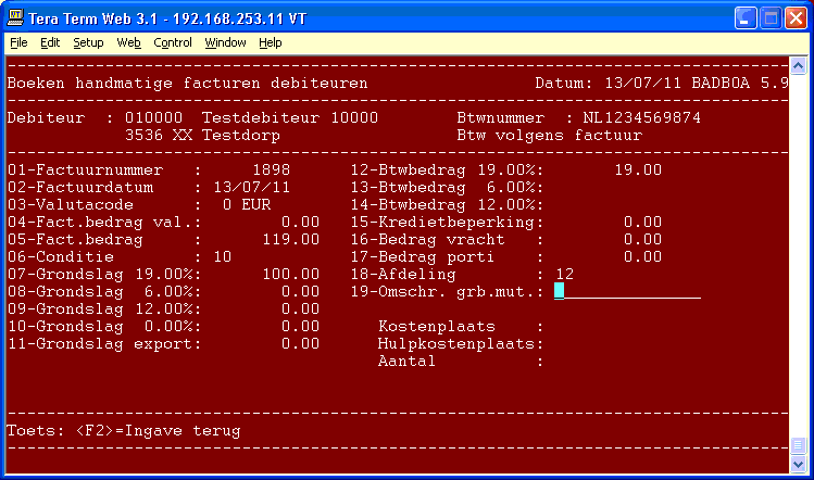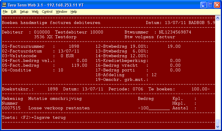Boekingsperiode PPJJ Default (<RETURN>) is de huidige periode. Debiteurnummer 6 N / 9 A U kunt zoeken via één bij de debiteur opgegeven zoeksleutel. Na ingave van een debiteurnummer vraagt het programma of deze debiteur de juiste is, geef <RETURN> of N. Heeft u een zoeksleutel ingegeven, dan verschijnt een scherm waarin u kunt zoeken naar de gewenste debiteur. Geef de code (1 - 13) die aan het be- gin van de regel met de gewenste debiteur staat om die te selecteren. Via functietoetsen (zie on- derin het betreffende scherm) kunt u verder zoe- ken, terugzoeken, terug naar het debiteurnummer of de eerste regel selecteren. Na goedkeuring verschijnen rechts in het scherm het btwnummer en de daaraan gekoppelde btwcode- ring. Let daar goed op! Een verkeerde btwcode- ring heeft gevolgen voor de boekingen naar de btwmodule en dus ook voor het voorstel voor de btw-aangifte. 1 - Factuurnummer 8 N Een factuurnummer mag maar één keer voorkomen. Wanneer achter elkaar meerdere facturen worden ingegeven wordt het factuurnummer default steeds met 1 verhoogd. Via functietoets <F1> kunt u de btwcodering voor deze factuur wijzigen: 0: Btw volgens factuur 1: ICT-levering E.U. (nul-tarief) 2: Export buiten de E.U. 3: Btw verlegd/rookwaren (nul-tarief) 2 - Factuurdatum DDMMJJ Default (<RETURN>) is de huidige datum. 3 - Valutacode 2 N Met deze code bepaalt u of u het factuurbedrag in de basisvaluta wilt ingeven, of in de gewenste valuta. Valutacodes kunt u ingeven met programma 108 A/I/M Valuta. Default (<RETURN>) is valutacode '00'. 4 - Factuurbedrag 7 D 2 in valuta Wanneer de valutacode niet '00' is, dan kan het bedrag in valuta ingegeven worden. Het programma rekent het bedrag om naar de basisvaluta. 5 - Factuurbedrag 7 D 2 in basisvaluta 6 - Conditie 2 N U bepaalt hier welke betalingsconditie voor deze factuur moet gelden, door (voor Kavta-gebruikers) de code van die betalingsconditie (zie trefwoord BETALINGSKONDITIE) te vermelden. Het programma controleert niet of deze conditie ook werkelijk bestaat. Default (<RETURN>) is conditie '00'. 7 - Grondslagen 7 D 2 / De grondslagen zijn verplicht als u gebruik maakt 11 van de btwmodule. In het andere geval zijn ze fa- cultatief. Achter de tekst van de grondslag is het betreffende btwpercentage vermeld. De grond- slagen worden ook gebruikt om de defaultwaarde van de btwbedragen te berekenen. Via functietoets <F1> kunt u, als dat toegestaan is, de grondslagen overslaan. U krijgt een melding als de grondsla- gen verplicht zijn en u deze probeert over te slaan. 12 - Btwbedragen 7 D 2 / De btw-bedragen worden default vanuit de grond- 14 slagen berekend, maar zijn handmatig te wijzigen. Het programma kan btw-bedragen overslaan, deze zijn echter via functietoets <F2> op het volgende veld wel te bereiken. 15 - Kredietbeperking 7 D 2 16 - Bedrag vracht 7 D 2 17 - Bedrag porti 7 D 2 18 - Afdeling 2 N Wordt default gevuld met de afdeling uit de stam- gegevens. U kunt een andere afdeling ingeven, zo- dat deze openstaande post bij die afdeling wordt opgenomen. 19 - Omschrijving 15 A grootboekmutatie De verzamelrekeningen debiteuren, btw, krediet- beperking, vracht- en portikosten worden automa- tisch gejournaliseerd. In de betreffende journaal- regels wordt de hier ingevulde omschrijving opge- nomen. Kostenplaats/ 2 N hulpkostenplaats Wanneer in de systeemparameters met programma 616 A/I/M Systeemparameters is opgegeven dat met kostenplaatsen en hulpkostenplaatsen gewerkt wordt, dan kunt u die hier ingeven. Het programma vraagt per bedrag, indien gewenst, om deze gegevens. Via functietoets <F1> kan een info van het betreffende gegeven opgeroepen worden. Aantal 4 N Wanneer in de systeemparameters met programma 616 A/I/M Systeemparameters is opgegeven dat bij de kostenplaatsen, hulpkostenplaatsen en kostensoorten met aantallen gewerkt wordt, dan kunt u die ingeven. Het programma vraagt per bedrag om deze gegevens. Bevestiging Na invoeren van bovenstaande rubrieken vraagt het programma: GEGEVENS JUIST? <RETURN>/<N> Wanneer dit niet het geval is kunt u de rubrie- ken wijzigen.