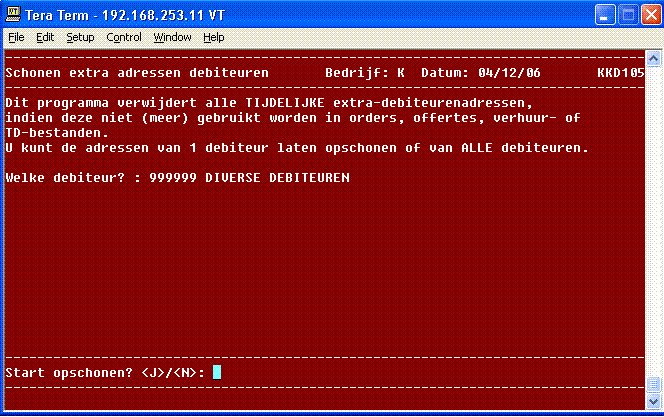 Dit programma gebruikt u om de tijdelijke extra debiteurenadressen te verwijderen. Automatisch verwijderd worden alle tijdelijke adressen die niet meer worden gebruikt in offertes, orders en eventuele voororders. Het programma controleert hierop.