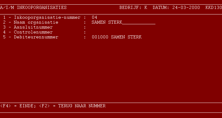Het bestand inkooporganisaties onderhoudt u met programma 214. Alleen de rubrieken 1,2 en 5 worden gebruikt. Bij het aanmaken van een nieuwe inkooporganisatie moet deze eventueel eerst met programma 200 als debiteur worden ingevoerd.