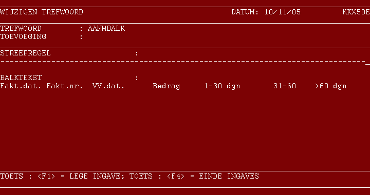 Trefwoord Rubriek Inhoud Omschrijving AANMBALK Bevat de inhoud van de af te drukken "balk" (indien van toepassing) Toevoeging Geen Streepregel 80 pos. maximaal Geef hier de volledige streepregel in,