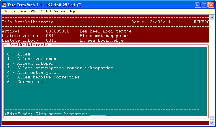 Tenslotte kunt u de opgeslagen historie (gedeeltelijk) verwijderen. U geeft hiertoe, na de keuze voor Schonen artikelhistorie een datum in (ddmmjj). Alle historie ouder dan de ingegeven datum zal worden verwijderd.