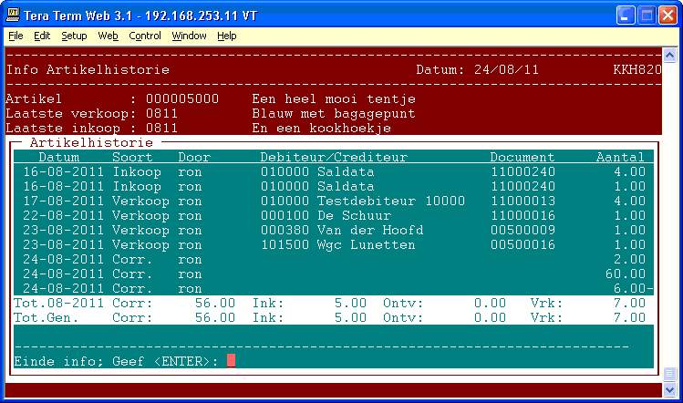 Wanneer u de artikelhistorie heeft opgeroepen vanuit programma Info artikelen (402) krijgt u de informatie op vergelijkbare wijze gepresenteerd.
