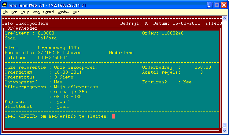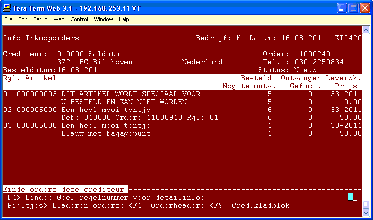 Werkwijze Start programma 466. 1 - Crediteur Geef de crediteur waarvan u de gegevens wilt raadplegen. U kunt ook een zoeksleutel ingeven. 2 - Ordernummer Geef het ordernummer, met <RETURN> zonder order- nummer kunt u zoeken. De gegevens worden getoond. U kunt met <RETURN> verder bladeren. Met <F2> terug naar stap 1 of met <F4> het programma verlaten.Hierna kunt u per regel de header- of detailinformatie opvragen.