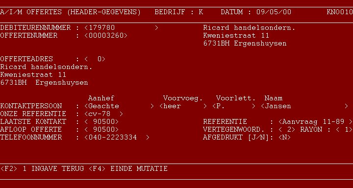 Debiteurennummer 6 N U kunt het debiteurennummer rechtstreeks invoeren, of zoeken via de zoeksleutels die bij de debiteur zijn ingegeven. De debiteur moet in het systeem bekend zijn; wilt u een offerte uitbrengen aan een 'nieuwe' klant, dan zult u deze eerst via programma 200 (A/I/M Debi- teuren) moeten invoeren. Wanneer u een niet-bestaand debiteurennummer ingeeft, dan wordt dit door het pro- gramma opgevat als zoeksleutel. Offertenummer 6 N Aanmaken nieuwe offerte: - <RETURN>: systeem maakt nieuw nummer aan. Muteren bestaande offerte: - Voer nummer in, of - <F3>: zoek in de aanwezige offertes voor deze debiteur. Geef u een foutief nummer in, dan maakt het sys- teem automatisch een nieuw aan, en gedraagt zich verder als bij het aanmaken van een nieuwe offerte. Offerteadres 3 N In het systeem aanwezige adressen kunt u oproepen met een 3 cijferige code. Default (<RETURN>) is het afwijkende factuuradres dat bij de betreffende debiteur is ingevoerd. Indien bij deze debiteur geen afwijkend factuuradres is ingevoerd, dan is de code 0 (geen afwijkend adres) default. U kunt een (nieuw) afwijkend adres aanmaken door een niet gebruikte code afwijkend adres in te geven met <F1>. U kunt dan invoeren: - Naam 23 A - Adres 23 A - Postcode 6 A - Plaats 17 A Het programma slaat dit dan op als een tijdelijk afwijkend adres (zie programma's 201 en 211 van de debiteurenmodule). Wanneer u een code ingeeft van een niet-bestaand afwijkend adres met <RETURN>, kunt u zoeken per sleutel, of met alle zoeksleutels op het scherm. Contaktpersoon - Aanhef 14 A Default (<RETURN>) is 'Geachte'. Indien gewenst kunt u een andere formulering intoetsen. Met <F3> kunt u in het trefwoord OKTK zoeken. - Voorvoegsel 9 A U kunt een voorvoegsel intoetsen (mevrouw, Drs. etcetera), of met <F3> kunt u zoeken in het tref- woord OFTK. - Voorletter 8 A - Naam 18 A - Afdruk Onder de adressering wordt afgedrukt: t.a.v. Voorvoegsel + Voorletter + Naam Als aanhef wordt afgedrukt: Aanhef + Voorvoegsel + Naam Bij het overzetten van de offerte naar order voegt het pakket de eerste 4 posities van de rubriek voorletter met de naam tot één veld samen. Onze referentie 7 A Deze referentie wordt altijd op de offerte afgedrukt. De ingave is verplicht. Laatste contact DDMMJJ De datum laatste contact wordt alleen in de offerte gebruikt. Bij het maken van een overzicht offertes of een overzicht offerte-stamgegevens kunt u dit veld als selektiecriterium gebruiken. Default (<RETURN>) is de huidige datum. Referentie 15 A In deze rubriek kunt u een eventuele referentie van de debiteur vermelden. Deze referentie wordt dan zowel op de offerte als op de orderbevestiging afgedrukt. Of deze referentie al of niet verplicht is geeft u aan met de code referentie in het debiteuren-stambestand. Afloop offerte DDMMJJ (vervaldatum) Deze datum komt (vanzelfsprekend) alleen in de offerte voor. Default (<RETURN>) is de huidige datum. Bij het maken van een overzicht of een overzicht offerte-stamgegevens kunt u deze rubriek als selektiecriterium gebruiken. Vertegenwoordiger 2 N Default (<RETURN>) is de code van de vertegenwoor- diger die u bij de debiteur heeft ingevoerd. U kunt deze code overnemen, of een andere code ingeven. Bij het maken van een overzicht offertes of een overzicht offerte-stamgegevens kunt u deze rubriek als selektiecriterium gebruiken. Ook kunt u statistieken per vertegenwoordiger bijhouden (zie de beschrijving van de statis- tiekmodule). Rayon 2 N Default (<RETURN>) is de code van het rayon die u bij de debiteur heeft ingevoerd. U kunt deze overnemen, of een andere code in- geven. Bij het maken van een overzicht offer- tes of een overzicht offerte-stamgegevens kunt u deze rubriek als selektiecriterium gebruiken. Ook kunt u statistieken per rayon bijhouden (zie de beschrijving van de statistiekmodule) Telefoonnummer 13 A Deze informatie komt alleen in de kop van de offerte voor. Default (<RETURN>) is het tele- foonnummer bij het stamadres van de debiteur. U kunt eventueel een ander nummer ingeven. Code/datum afgedrukt J/N + JJMMDD N of J (indien afgedrukt wordt de datum van afdruk op het scherm gemeld). Deze rubriek staat bij het invoeren van een nieuwe offerte op N (niet afgedrukt). Bij het afdrukken wordt deze code op J gezet, en de datum van afdrukken ingevuld. Wanneer u een offerte muteert moet deze code weer op N zetten, zodat bij de vol- gende keer afdrukken de offerte weer wordt meegenomen. Als u door omstandigheden een offerte niet kunt voltooien, zet dan de code op J zodat de offerte niet voortijdig wordt afgedrukt.