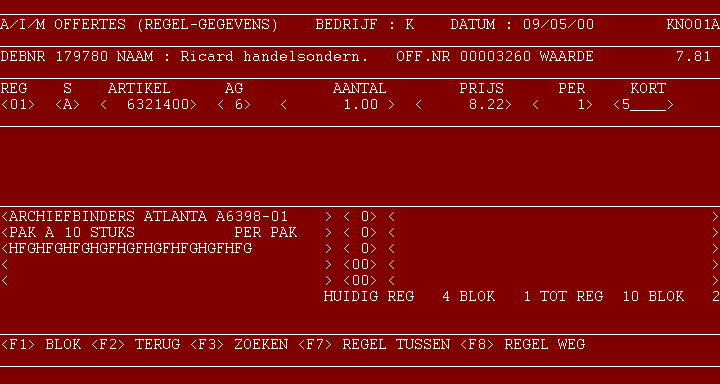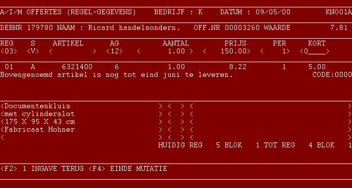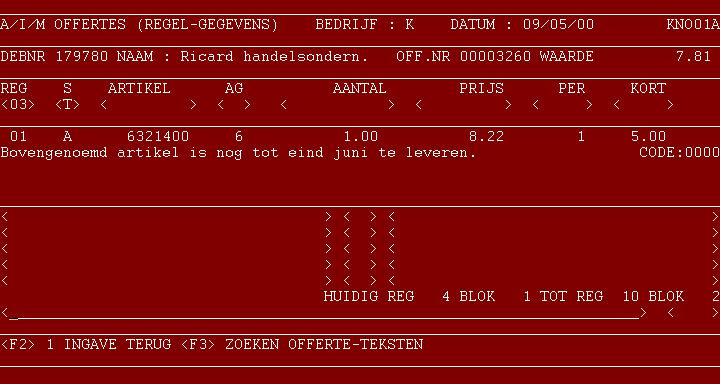 Werkwijze aanmaken Start programma 530. Debiteur Geef de debiteur. U kunt gebruik maken van een zoeksleutel. De NAW-gegevens van de debiteur worden op het scherm getoond. Offertenummer Het systeem maakt na <RETURN> een nieuw offertenummer aan. Kopgegevens Voer de kopgegevens in: - Offerte-adres - Contaktpersoon - Onze referentie (verplicht) - Datum laatste contact - Referentie (van de klant) - Afloopdatum - Vertegenwoordiger- en rayoncode - Telefoonnummer (informatief) - Code en datum afgedrukt Keuze Kies voor ingeven van de regels, of voor muteren van de zojuist ingegeven kopregels. <R> = VERWERKEN REGELS <K> = MUTEREN HEADER-GEGEVENS Regelgegevens Voer de regelgegevens in. U kunt 4 regelsoorten ingeven: artikelregels, vreemd- productregels, tekstregels en kortingsregels. Deze typen regels worden verderop beschreven. Het verdient aanbeveling om bij het aanmaken van een offerte wat 'ruimte' in de regelnummering te houden, zodat u later zonder problemen regels kunt invoegen. De laatste 4 ingevoerde regels worden in de midden- balk getoond. Tijdens het invoeren van regels kunt u met <F3> bladeren door alle reeds ingevoerde regels. Het aanmaken van een offerte sluit u af met <F4>. U keert dan terug naar de ingave van het debiteur- nummer, waar u een volgende offerte kunt aanmaken of muteren, of het programma kunt beëindigen met <F4>. U keert dan terug naar het menu. Werkwijze muteren Start programma 530. Debiteur Geef de debiteur. U kunt gebruik maken van een zoeksleutel. De NAW-gegevens van de debiteur worden op het scherm getoond. Offertenummer U kunt direct het offertenummer ingeven, of met <F3> zoeken in de offertes voor deze debiteur. Keuze Kies voor muteren van de regels of van de kop- gegevens. <R> = VERWERKEN REGELS <K> = MUTEREN HEADER-GEGEVENS Kopgegevens Vanaf de rubriek 'offerteadres' loopt u met <RETURN> naar de rubriek die u wilt wijzigen. Voer de nieuwe gegevens in, en loop verder met <RETURN> naar de laatste rubriek. U keert daarna terug naar de keuze. Denk erom dat u (indien nodig) de afdrukkode weer op 'N' zet als u de offerte weer wilt afdrukken. Regelgegevens U kunt nieuwe regels invoeren, en bestaande regels wijzigen. Met <F3> kunt u vanaf regel 01 door de reeds ingevoerde regels bladeren, met <F1> krijgt u informatie over de reeds ingevoerde regels in de middenbalk van het scherm. Einde Met <F4> na het wijzigen van de kopgegevens of na het wijzigen van de regelgegevens beëindigt u het muteren van de offerte. U keert dan terug naar de ingave van het debiteurnummer, waar u een volgende offerte kunt aanmaken of muteren, of het programma kunt beëeindigen met <F4>, waarna u terugkeert naar het menu.